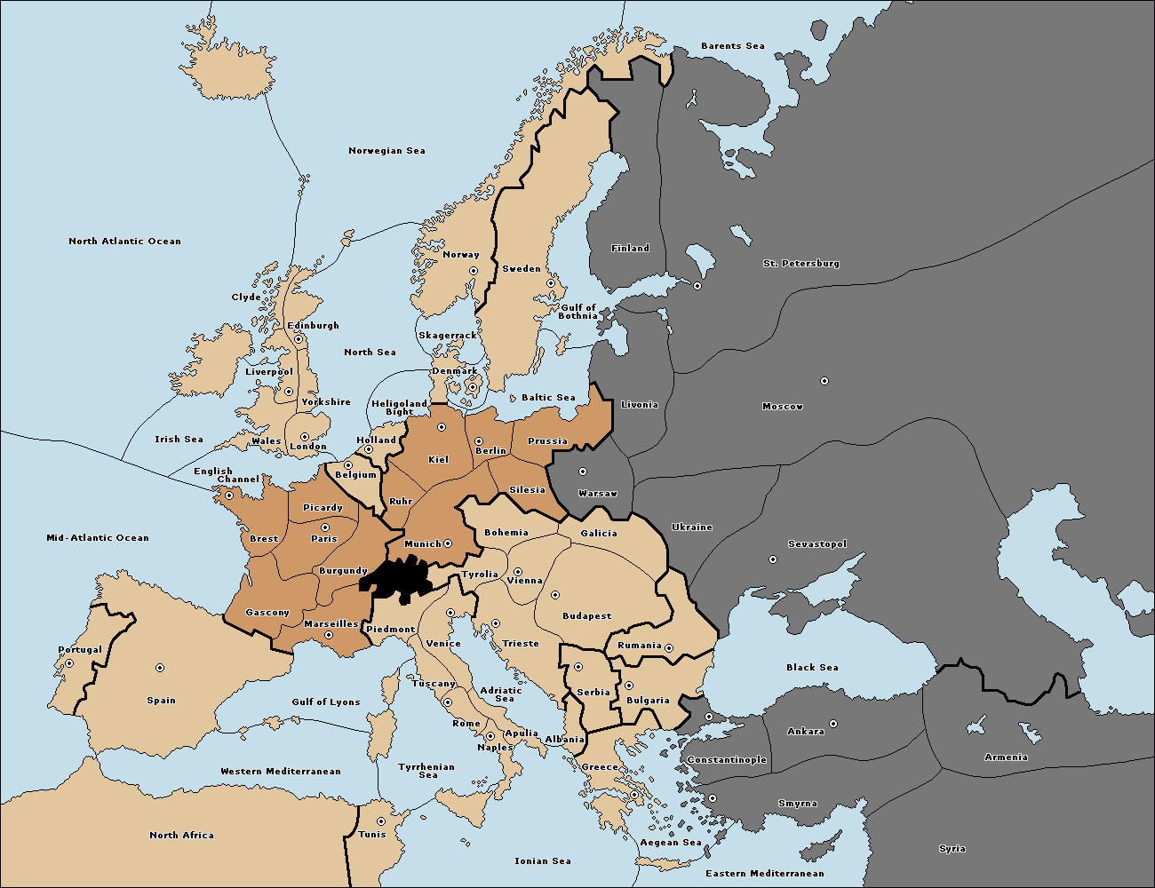 The standard Diplomacy map of Europe, but each player take two countries France and Germany against Russia and Turkey.