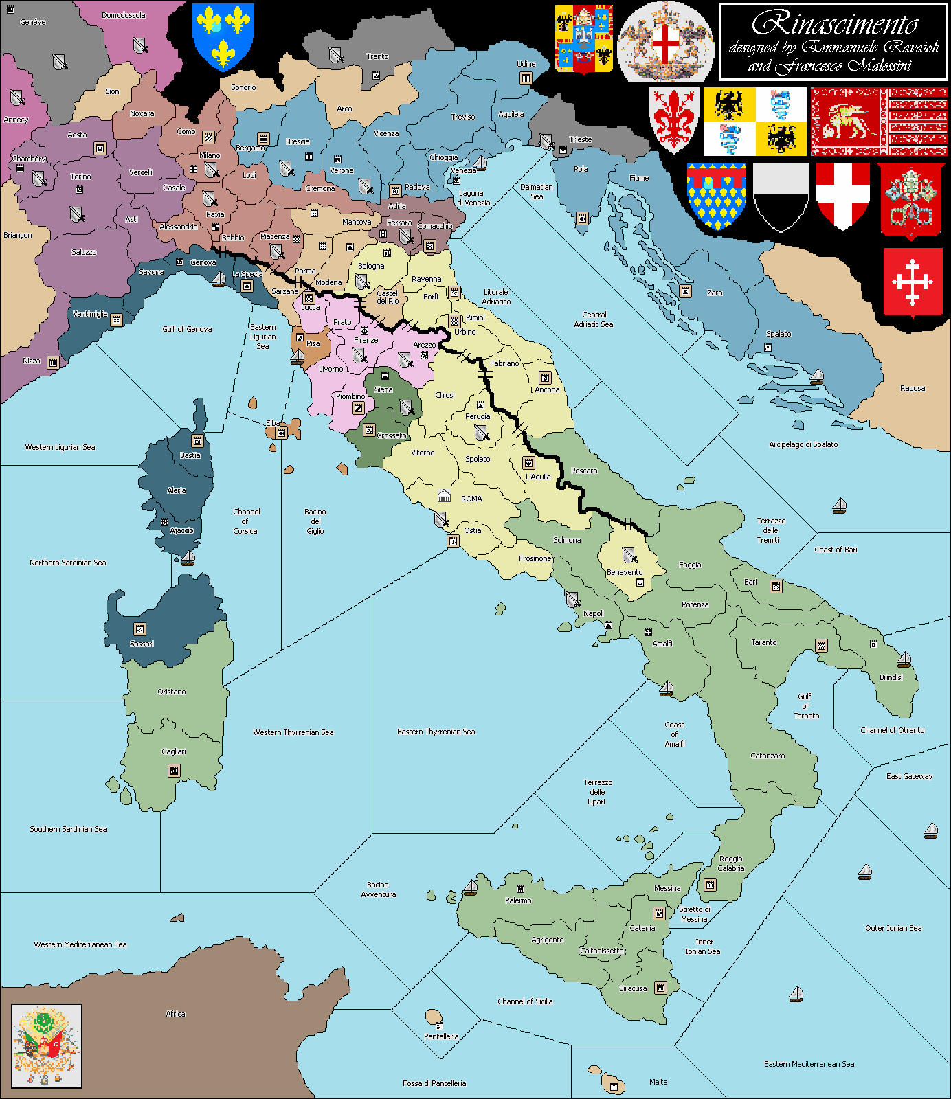 Italia, Rinascimento: Italy is fragmented in dozens of different states, divided by ancient hatreds and by unstable boundaries. Shall one power emerge from the chaos and join together the Italian nation? The Dukes of Savoia, based in Torino, have to decide where to focus their interests: either in the French or Italian slope of the Alps. The Dukedom of Milano is ready to extend his power beyond his habitual borders. The Republic of Venezia, a traditionally maritime power, while sending fleets towards the eastern Mediterranean Sea, tries to find his way throughout the inland. Her traditional rival, the Republic of Genova, establishes a strong position at the opposite side of the peninsula. In Tuscany, the free cities of Pisa and Siena fiercely fight against the Republic of Firenze, which desires to rule the entire region. Sitting in the ancient city of Roma, the Pope governs the Stato della Chiesa, the large Papal State comprising the whole central Italy, and spreads his influence even in the hearth of the Kingdom of Napoli. The small free Dukedom of Ferrara, tight between the Venetian territories and the papal city of Bologna, shall use every diplomatic skill to gain the sympathy of both sides. The vast Kingdom of Napoli needs to consolidate its actual possessions before launching a powerful strike to the northern Italy. While the Italian powers are struggling each other, menacing enemies hanker after the prosperous cities and plan a full-scale offensive. The French press on the natural boundary of the Alps, eager to swarm around the rich plains. The Turkish wish to take possession of the Italian coasts in order to start a massif invasion and extend their dominion to the other side of the Mediterranean Sea.