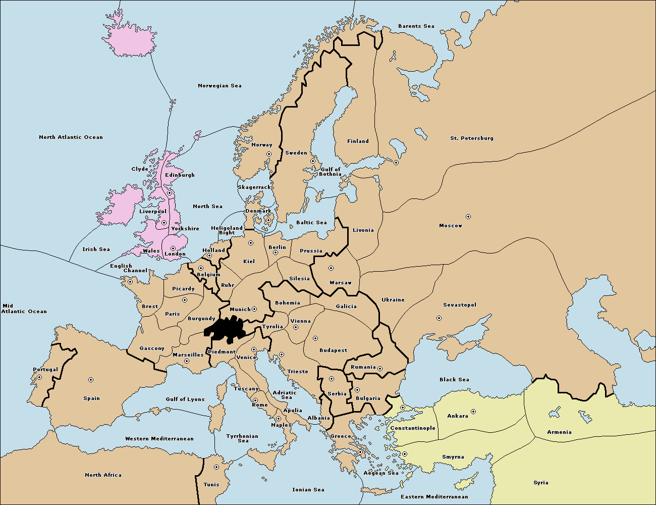 The standard Diplomacy map of Europe, but with England and Turkey as the only playable countries. To offset the imbalance of Englands start, his fleets now start in open seas